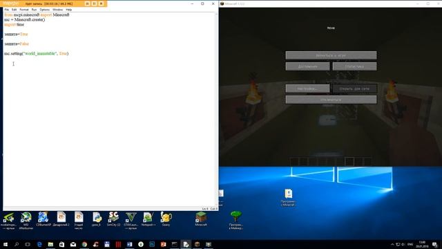 Проверка условий на «истину» и «ложь» используется очень часто в программировании. На конкретны[ примерах в Minecraft покажем как это работает Если условие «истинно», то его значение True, а если «ложно» — False. Логические значения похожи на положения выключателя света: либо свет включен (значение True), либо выключен (False). Еще пример, допустим защита = True Здесь мы присваиваем переменной защита значение True. А чтобы убрать защиту, ей нужно присвоить значение False: защита= False С помощью команды set-ting("world_immutable", True) в Майнкрафте мы можем сделать блоки неизменяемыми, так что разрушить их будет невозможно. Пример 1. Сделаем блоки защищенными для ударов. mc.setting("world_immutable", True) Пример 2. Сделаем блоки уязвимыми для ударов через 10 сек. защита=True mc.setting("world_immutable", защита) защита=False time.sleep(10) mc.setting("world_immutable", защита) mc.postToChat("Волшебство закончилось")