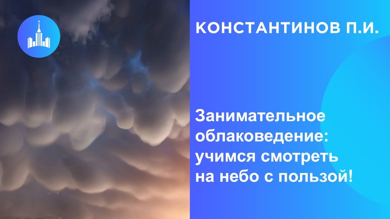 Занимательное облаковедение: учимся смотреть на небо с пользой! Издревле люди в попытках заглянуть в будущее смотрели на небо. И там они обычно видели облака. И не только в виде белогривых лошадок. Облакам посвящали сонеты, художники соревновались в реалистичном изображении облачности на своих полотнах, а пилоты воздушных судов рассекали их порой с риском для жизни..... Профессиональный метеоролог и путешественник Павел Константинов расскажет об истории наблюдений за облаками, научит разбираться в их видах. На лекции коснемся искусства прогноза погоды, проведем небольшой шуточный мастер-класс по прогнозированию, а также узнаем, что произошло с человеком, который первым дерзнул «оседлать грозу» и как выглядят «облака судного дня». Естественно, будет много красивых фотографий, а главное - после лекции вы точно будете смотреть на небо совсем другими глазами! Лектор: Константинов Павел Игоревич - доцент кафедры метеорологии и климатологии географического факультета МГУ, кандидат географических наук, двукратный лауреат (2016, 2019) премии Европейского Метеорологического Союза за исследования в области влияния климата на здоровье городских жителей. Шестикратный покоритель Северного Полюса.