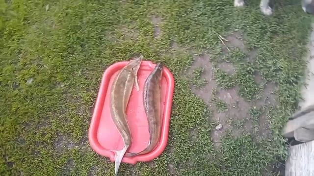 Собаки знакомятся с рыбой.