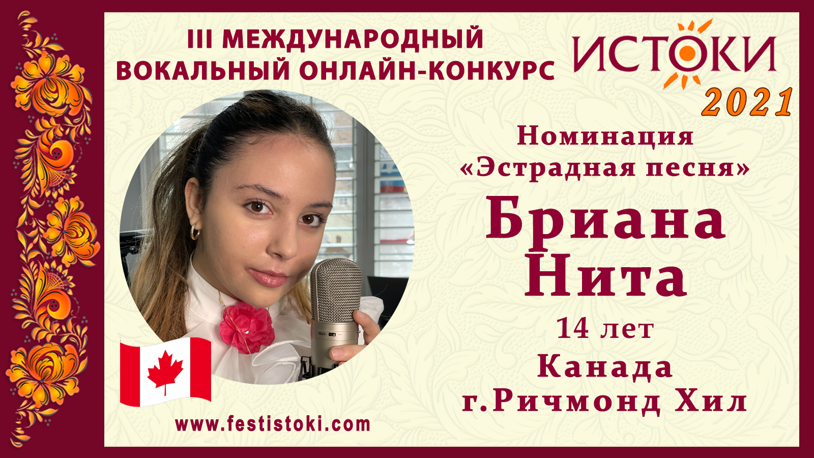 Лауреат I степени III Международного вокального онлайн-конкурса «Истоки». Номинация "Эстрадная песня". Песня "It's a Man's World" Black and White_Moment 3. Сайт: www.festistoki.ru / www.festistoki.com E-mail: festistoki@mail.ru