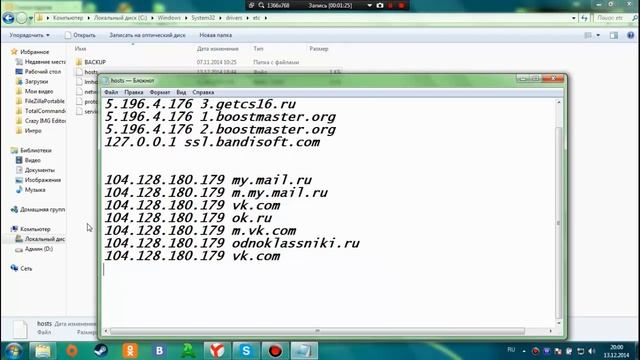 Вирус блокирующий социальную сеть как в ВКонтакте и Однолкассники(ОК). Путь: Компьютер/Локальный диск:C/Windows/System32/drivers/etc/hosts