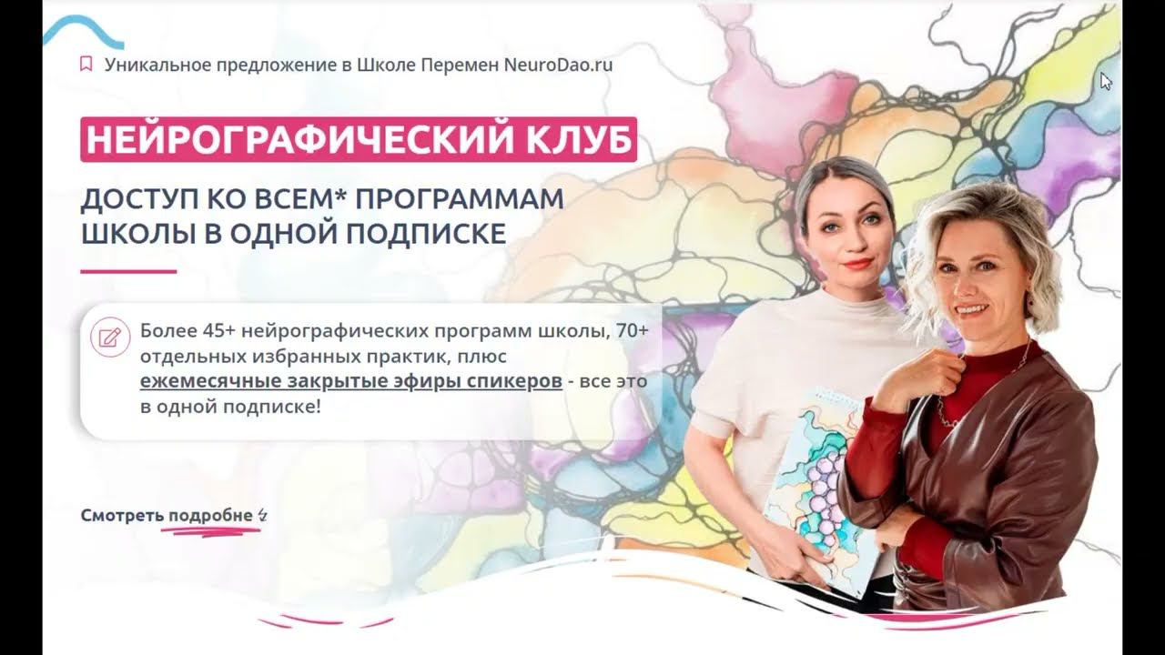Клуб Школы Перемен NeuroDao - подходит как полным новичкам так и опытным нейрографам! Более 45 полноценных программ, более 70 закрытых практик, эфиры спикеров – все это доступно в Клубе по одной подписке! https://neurodao.ru/club/?utm_source=youtube&utm_medium=video