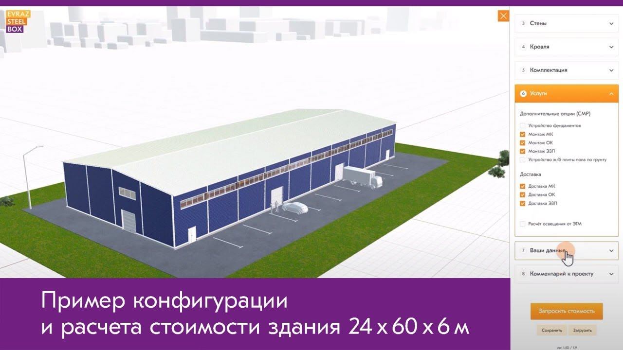 Если Вы хотите самостоятельно создать визуальную модель здания по требуемым размерам, выбрать комплектацию и за пару минут получить расчет стоимости - переходите на страницу конфигуратора по ссылке: https://evrazsteelbox.ru/configurator-3d/
