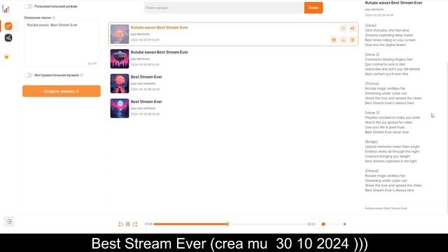 Сообщение на стрим - донат https://www.donationalerts.com/r/best_stream_ever 2024-10-30 11-16-59 Текст: Rutube канал Best Stream Ever pop electronic 2024-10-30 09:14:09 [Verse] Click that play and feel alive Streams exploding deep inside Best times rolling on your screen Dive into the digital dream [Verse 2] Comments blazing fingers fast Epic moments sure to last Subscribe and don't you fall behind Best content you'll ever find [Chorus] Rutube magic endless fun Streaming under cyber sun Share the love and spread the cheer Best Stream Ever's always here [Verse 3] Playlists stacked to make you smile Watch the joy spread for miles Live your life in pixel hues Best Stream Ever never lose [Bridge] Upload moments make them bright Endless views all through the night Creators bringing you delight Best dreams captured in the light [Chorus] Rutube magic endless fun Streaming under cyber sun Share the love and spread the cheer Best Stream Ever's always here Rutube канал Best Stream Ever Перевод: Rutube канал Best Stream Ever поп -музыка электронная 2024-10-30 09:14:09 [Куплет] Нажми на воспроизведение и почувствуй себя живым Потоки, взрывающиеся глубоко внутри Лучшие времена, прокручивающиеся на твоем экране Погрузись в цифровую мечту [Куплет 2] Быстро комментируй, не забывай про пальцы Эпические моменты наверняка надолго запомнятся Подписывайся и не отставай Лучший контент, который ты когда-либо найдешь [Припев] Волшебное бесконечное веселье на Rutube Трансляция под кибер-солнцем Делитесь любовью и распространяйте приветствия Лучший стрим всегда здесь [Куплет 3] Плейлисты, составленные так, чтобы заставить вас улыбнуться Наблюдайте, как радость распространяется на многие километры вокруг Живите своей жизнью в пикселях Лучший стрим Никогда не проигрывай [Переход] Загружай моменты, делай их яркими Бесконечные просмотры всю ночь напролет Создатели радуют тебя Лучшие сны, запечатленные при свете [Припев] Волшебное бесконечное веселье на Rutube Трансляция под кибер солнцем Делитесь любовью и приветствуйте других Лучший стрим всегда здесь Rutube канал Best Stream Ever