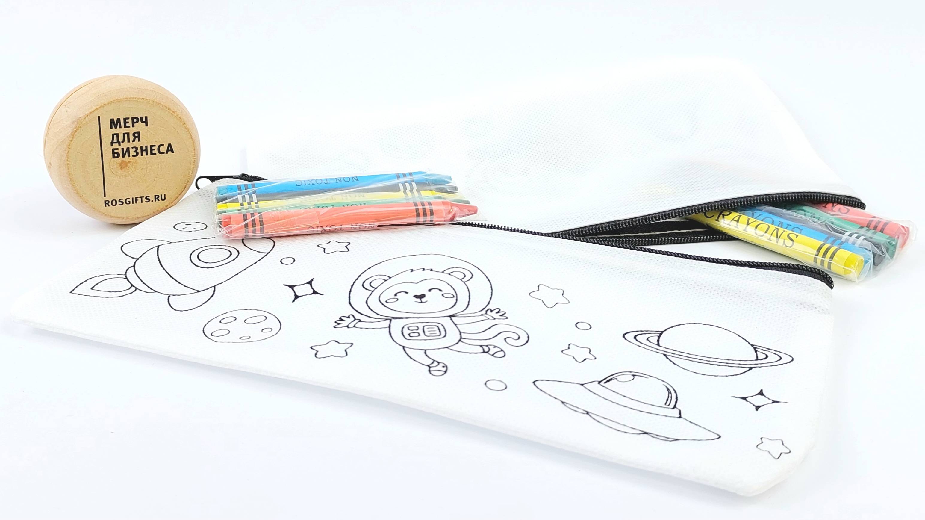 Небольшой пенал из нетканного материала с поверхностью для раскрашивания восковыми мелками (они входят в комплект). В наборе пенал-раскраска, 5 восковых мелка. Поставляется в полиэтиленовом пакете. Условия заказа по ссылке https://rekonagrand.ru/goods/117571