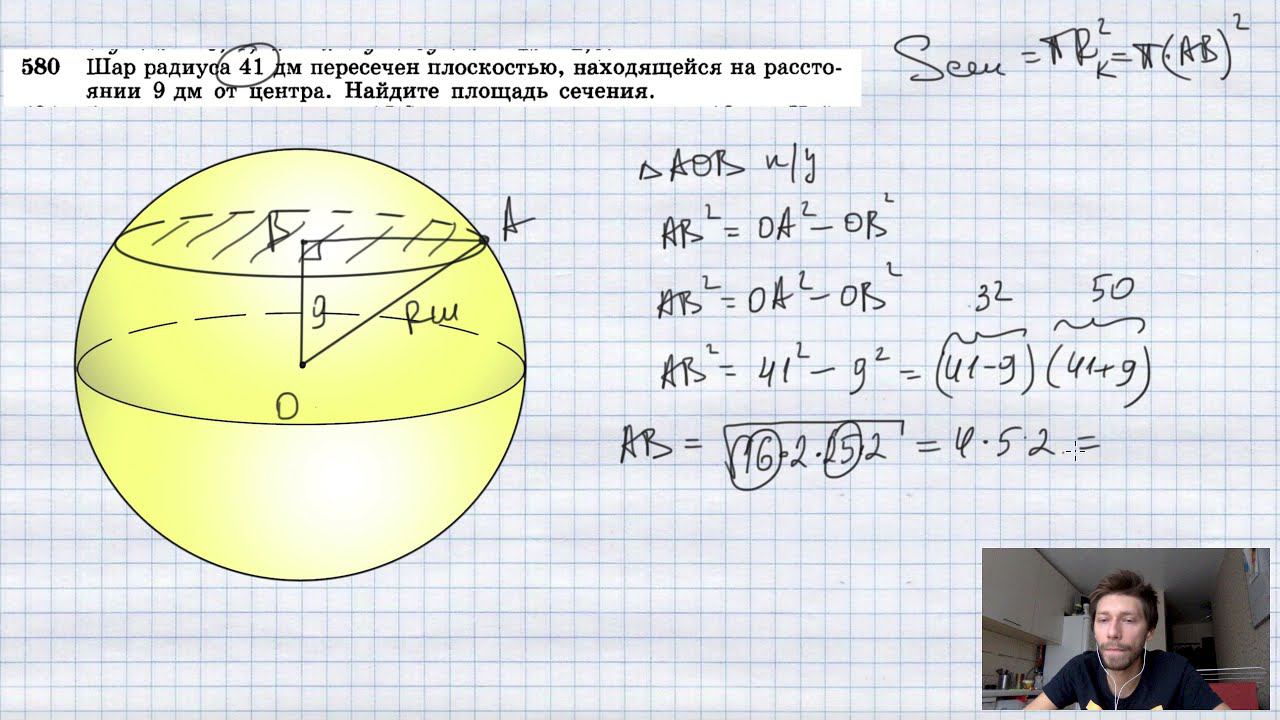№580. Шар радиуса 41 дм пересечен плоскостью, находящейся на расстоянии 9 дм от центра. Найдите площадь сечения. TikTok - https://vm.tiktok.com/WJJwK9 Like - https://likee.com/user/@ge0metriya Мой второй канал для подготовки к ЕГЭ и ОГЭ - https://www.youtube.com/ЕвгенийСумин Инстаграм - https://www.instagram.com/EGE_OGE.math Личный инстаграм - https://www.instagram.com/ee_sumin VK - https://vk.com/evgeniysumin FB - https://www.facebook.com/EvgeniySumin