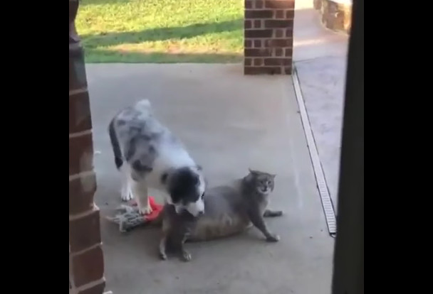 Толстый кот отбивается от пса. #кот #толстый #собака #прикол