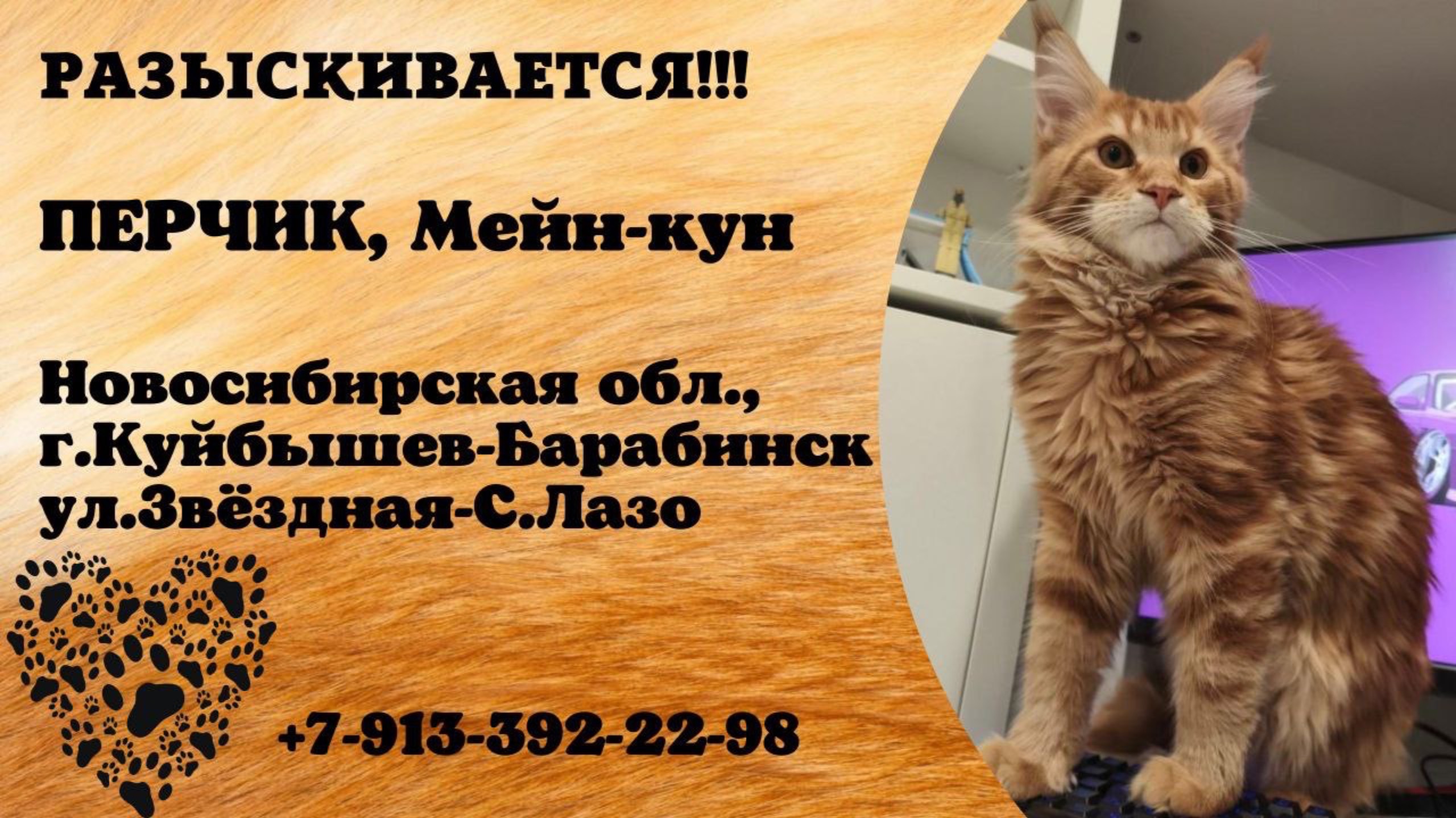 Новосибирская Куйбышев - Барабинск Пропал кот Вечером 27.06.2025 года пропал без вести наш малыш в районе улиц : Звездная- С. Лазо😭 Я не теряю надежды найти его или получить весточку о его состоянии. Для меня главное, чтобы он был жив, здоров , накормлен , обласкан … Да, котик породистый, красивый, большой и стоит не малых денег, только за всей внешней мишурой кроется много подводных камней, серьезная ответственность , терпение…У моего рыжего друга есть особенности в поведении, поэтому не каждый сможет с ним совладать. Если вы взяли его себе, пожалуйста, позаботьтесь о нем и не выбрасывайте, когда наиграетесь, но если уж так случилось, что наигрались , сообщите о его местонахождении, и мы его заберем обратно 🙏 мы очень ждём хоть малейшую весточку о нашем любимом малыше ❤️🙏 телефон для связи: + 7 913 392 22 98. Буду благодарна за репост 🙏 Инфо https://vk.com/wall-198815410_200990 #пропал_кот#Куйбышевбарабинск#Новосибирская #мейн_кун