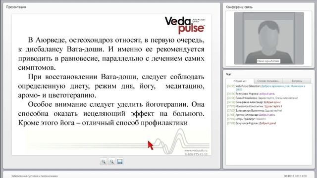 Лекция посвящена таким заболеваниям суставов и позвоночника, как остеохондроз и артроз. Эксперт расскажет вам о причинах и клинических проявлениях остеохондроза и артроза. Также вы узнаете об аюрведических подходах в терапии данных заболеваний. Будут проанализированы индексы "ВедаПульс" при заболеваниях суставов и позвоночника. Эксперт: Арчибасова Елена Алексеевна, к.м.н., врач, доцент кафедры нормальной физиологии НГМУ