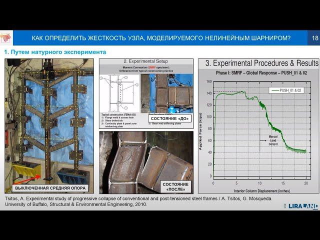 Разработчик материала Дробот Д.Ю., гл. конструктор ЗАО "НСК". Использование новых типов конечных элементов (КЭ 295 и 296), появившихся в версии ЛИРА-САПР 2021. Эти конечные элементы нелинейных связей могут использоваться в качестве нелинейных шарниров, применяемых для моделирования податливости узлов строительных конструкций. Тайминг: 00:00 Вступление 00:21 Рекомендуемая литература 03:42 Раздел 1. Линейные и нелинейные шарниры. 04:52 Классификация узлов 08:10 Применение нелинейных шарниров в расчетах 11:31 Виды нелинейных шарниров (одноосные, многоосные, упругие, упруго-пластические) 14:18 Двух и одно узловой КЭ нелинейных связей (аналоги КЭ 295/296 с учетом нелинейной работы) 16:16 Как определить жесткость узла, моделируемого нелинейным шарниром? 20:10 EN 1993-1-8. Как упростить закон нелинейного деформирования шарнира? 23:54 Раздел 2. Некоторые положения норм США (GSA и UFC 4-023-03), касающиеся учета жесткости узлов в расчетах на прогрессирующее обрушение 28:42 Кратко о процедуре линейного квазистатического расчета LSP и нелинейного квазистатического расчета NSP 32:11 Пример 1. Сравнение шагового и итерационного методов при расчете простой металлической рамы на прогрессирующее обрушение 35:02 Пример 2. Влияние нелинейной жесткости узлов. Материалы, упоминающиеся в докладе: - Водопьянов, Р. Ю. Доклад «Новая система "Прогрессирующее обрушение"» на онлайн презентации новой версии ПК "Лира-САПР 2020", https://youtu.be/gWdO8dF9X4c - Дробот Д. Ю., Доклад «Расчет на прогрессирующее обрушение по актуальным нормам США (UFC 4-023-03-2016, GSA2016). СП 385: критика и рекомендации для развития». Научно-практическая конференция «Актуальные проблемы численного моделирования, расчетов, проектирования, экспертизы и обеспечения безопасности зданий и сооружений», 2020. https://youtu.be/EhEsOrfHMLs - Губченко В.Е. Моделирование системы сейсмоизоляции на примере резинометаллических опор в программном комплексе ЛИРА-САПР. М., 2020. https://rflira.ru/files/events/2020/L... - Бароев Р. В., Воронков С. А. Вебинар «IDEA StatiCa: Учёт жёсткости узлов при расчёте стальных каркасов». НИП-Информатика, 2020. https://youtu.be/6T84xTT8u98 - Бароев Р. В., Воронков С. А. Вебинар № 6 «ETABS: Динамика и нелинейность». Информатика, 2019. https://youtu.be/ej0EP7Se6UA