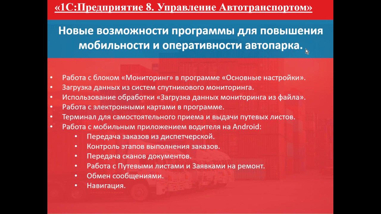 Запись вебинара от 21 мая 2020 года на тему "Новые возможности для повышения мобильности и оперативности автопарка" Программа вебинара: Работа с блоком «Мониторинг» в программе «Основные настройки». Загрузка данных из систем спутникового мониторинга. Использование обработки «Загрузка данных мониторинга из файла». Работа с электронными картами в программе. Терминал для самостоятельного приема и выдачи путевых листов. Работа с мобильным приложением водителя на Android: передача заказов из диспетчерской; контроль этапов выполнения заказов; передача сканов документов; работа с путевыми листами и заявками на ремонт; обмен сообщениями. навигация.