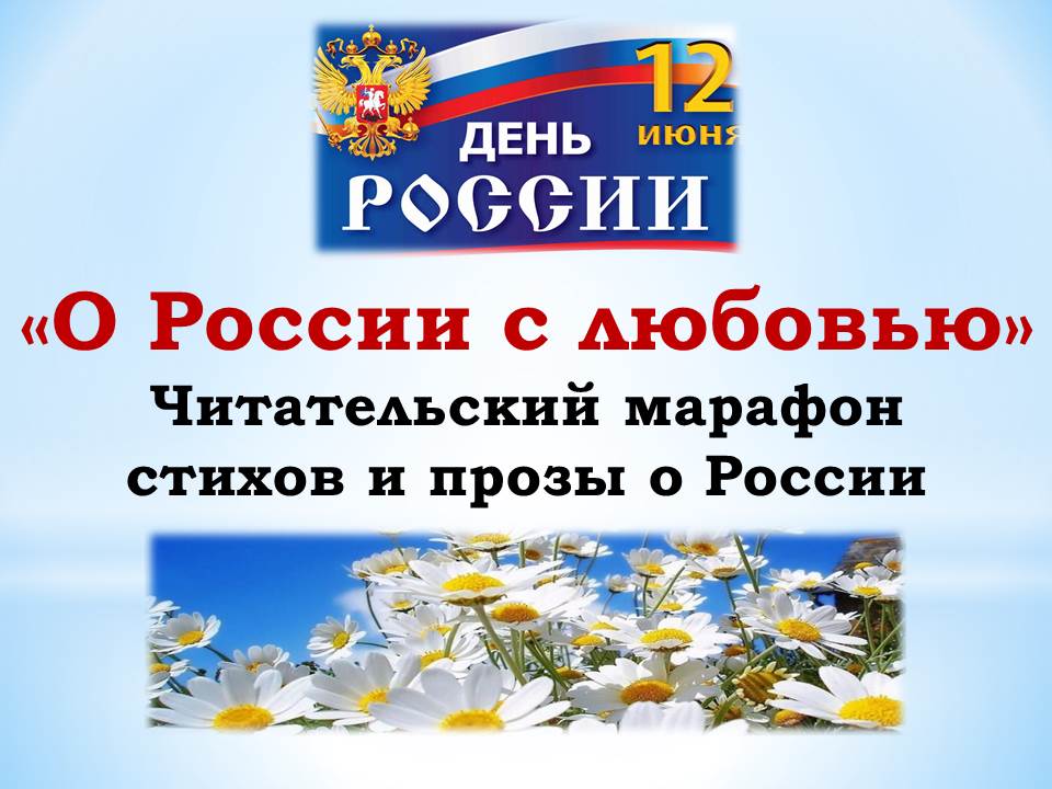 Посетители библиотеки всех возрастов накануне Дня России откликнулись на предложение поучаствовать в акции «О России с любовью» - читательском марафоне стихов и прозы о нашей любимой Родине. Каждый участник мог выбрать автора и произведение по своему желанию. Благодарим всех участников акции, которые показали, насколько обширна, разнообразна, красива и интересна наша Россия. И предлагаем посмотреть фильм по итогам читательского марафона.