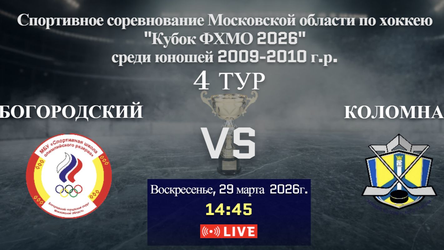 ССМО Кубок ФХМО. 4 ТУР. Юноши 2009-2010 г.р. 29.03.2026г. 14:45 4 ТУР СШОР Богородский (г. Ногинск) - Коломна (г. Коломна)