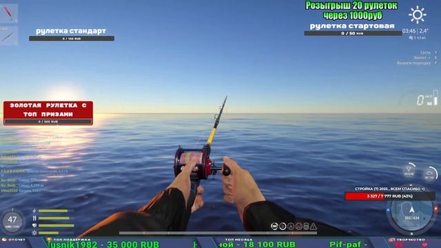 Поддержка донатом https://www.donationalerts.com/r/kalyamba11 Альтернативный донат https://new.donatepay.ru/@1032463 5536913964533059 карта Тинькоф Если стрим лагает,смотри стрим на трово https://trovo.live/s/Kalyamba_na_Ribalke Мой ВК - https://vk.com/kalyantv НИК в игре kalyan11 НАШ ДИСКОРД СЕРВЕР https://discord.gg/mSbnTJK8TB Заказ водоема на 1 час - 500р ( весь стрим 2500р ) Модерка на канале 1200р ( каждая следующая на 100р больше) Озвучка доната на 40р,50р,100р,200р,300р,500р,1000р ✅Призы в рулетке "ЗОЛОТАЯ" ✔ ЗОЛОТО ✔ ПРЕМ ✔ КАТУШКИ РАПТОР 40, АЗИМУТ 10000, СИЛЬВЕР 80, ТАЙГА с 30 ✔ ПАЛКИ ПИЛКЕРНАЯ, ДОНКА МОРСКИЕ, ✔ РОД ПОД, СТУЛЬЯ ✅Призы в рулетке СТАНДАРТ : ✔ катушка "РАПТОР 40" ✔ катушка "АЗИМУТ 10000" ✔ катушка "ТАЙГА С30, С40," ✔ катушки 60 для медного ( ЭВИИ, НАТОРЫ, ГОЛДА, и тд) ✔ ПИЛКЕРНОЕ УДИЛИЩЕ КОРОЛЕВА ОКЕАНА ✔ Морское Донное удилище ✔ прем ( 3, 7, 30 дней) ✔ золото ( 1, 3, 5, 10, 20 ,50) ✔ билет на море ( 1, 3, 5 дней) ✔ голд наживка и др. ✅Призы в рулетке "СТАРТОВАЯ" ✔ катушка "silver80" ✔ катушка "БЕЛЫЙ КАЛИБР" ✔ катушка "Черный калибр" ✔ катушка "Протон" ✔ катушка "Нарга 6000" ✔ Набор Фидерист и спинингист ✔ Карповик Фортуна ✔ фидерные удилища ✔ прем, золото, алкашка, наживки и тд P.s Рулетка это не казино, а награда за поддержку стримера. Вечный ТОП ПОДДЕРЖКИ (11.05.2024) 1. Dimon_pokemonchik 119 784 2. Interceptor 75 508 3. Skreb79 71 261 4. une personne 68 619 5. Нарвал77 31 550