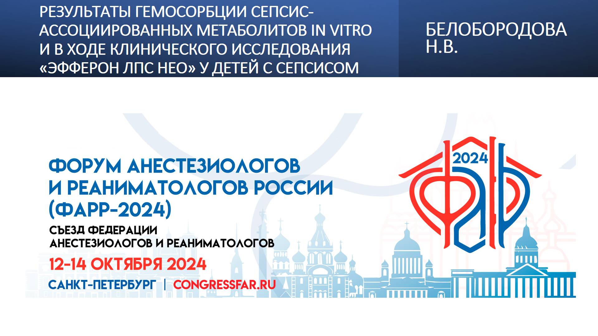 Видеозапись ФАРР-2024, XXII съезд Федерации анестезиологов и реаниматологов 12-14 октября 2024, Санкт-Петербург. Наталья Владимировна Белобородова "Результаты гемосорбции сепсис-ассоциированных метаболитов in vitro и в ходе клинического исследования «Эфферон ЛПС НЕО» у детей с сепсисом" Информация, размещенная на канале, предназначена исключительно для медицинских специалистов