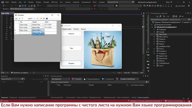 https://kursovik.com/programming/101450428.html Автоматизированная Информационная Система «Турфирма». Курсовая работа. Среда разработки: Visual Studio. Технология разработки: WindowForms. Среда программирования: Visual C# .NET 2019. База данных: MS SQL Server 2019. Программа позволяет регистрировать справочные данные о странах и турах, а также фиксировать клиентов турагентства и продажах туров. На основании зарегистрированных данных можно сформировать отчеты о продаваемых турах с указанием цены, а также рейтинг клиентов с указанием затраченных средств в турагентстве. Приобрести исходники данной программы Вы можете, заполнив следующую форму: https://kursovik.com/programming/101450428.html#form Заказать отчёт(описание): https://kursovik.com/programming/101450428.html#pz_need Заказать модификацию: https://kursovik.com/uniform.html?modify=101450428 Заказать новую программу: https://kursovik.com/programming_order.html?camefrom=youtube Задать вопрос автору: https://kursovik.com/programming/101450428.html#vopros Инструкция по установке и настройке MS SQL Server: https://youtu.be/3D5SqZoOmrw Наши готовые работы по программированию: https://kursovik.com/progtopic.html?camefrom=youtube Наш Телеграм-БОТ для поиска готовых работ по программированию https://t.me/kursovikcom_bot , в нашей базе более 5и тысяч готовых работ. Разработка программ на заказ согласно Вашему заданию: https://kursovik.com/programming_order.html?camefrom=youtube Мы пишем программы практически на всех языках программирования, работаем с различными базами данных, выполняем как мелкие задачки, так и крупные проекты. Разрабатываем и запускаем в работу ЧАТ-БОТы. Обращайтесь - всегда будем рады Вам помочь! Адрес нашего сайта: https://kursovik.com Наш Телеграм-канал: https://t.me/kursovik Наша группа ВК: https://vk.com/kursovik Наш Instagram: https://instagram.com/kursovikcom Наш YouTube-канал: https://youtube.com/@kursovik_com #курсоваяработа #базыданных #visualstudio #программирование