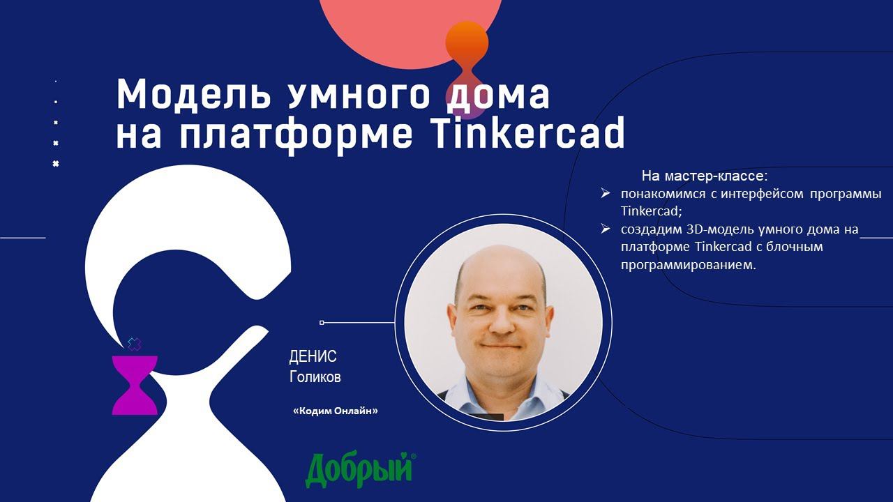 Мастер-класс «Кодим Онлайн» «Создаем модель умного дома на платформе Tinkercad» На мастер-классе: познакомимся с интерфейсом программы Tinkercad; создадим 3D-модель умного дома на платформе Tinkercad с блочным программированием. Для участия нужно: Зарегистрироваться на платформе: https://www.tinkercad.com/. Спикер: Денис Голиков Финалист конкурса инноваций в образовании 2015г. Автор бестселлеров по детскому программированию на Scratch и Arduino. Подробнее познакомиться с курсами Дениса можно на сайте: https://codim.online/.