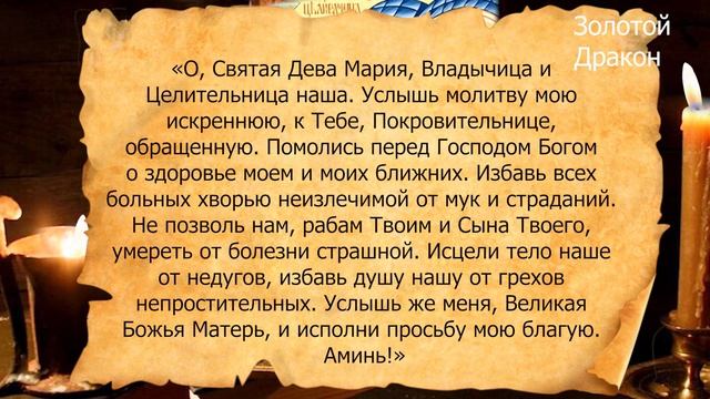 счёт сбербанк - 4276 3801 0103 1685 Узун Александр Александрович Uzun Aleksandr Aleksandrovich +7 977 359 57 14 донат - https://www.donationalerts.com/r/bereginay Дорогие мои зрители, в связи с тем что реклама в ютюб отключена, для продолжения работы всей команды канала, я прошу вашей помощи, даже 50, 100 рублей в месяц, помогут нам. Спасибо Вам за поддержку. Большое спасибо тем, кто уже откликнулся на нашу просьбу о помощи. В этом видео я расскажу молитву иконе Божией Матери «Целительница», перед святым ликом молятся об исцелении от самый страшных и неизлечимых болезней. Дорогие мои зрители, всем приятного просмотра. Ссылка на это видео : https://clck.ru/dYU3f Молитва у иконы Божией Матери «Целительница»: "О, Святая Дева Мария, Владычица и Целительница наша. Услышь молитву мою искреннюю, к Тебе, Покровительнице, обращенную. Помолись перед Господом Богом о здоровье моем и моих ближних. Избавь всех больных хворью неизлечимой от мук и страданий. Не позволь нам, рабам Твоим и Сына Твоего, умереть от болезни страшной. Исцели тело наше от недугов, избавь душу нашу от грехов непростительных. Услышь же меня, Великая Божья Матерь, и исполни просьбу мою благую. Аминь!" #икона"Целтельница" #молитваоздоровье #молитваотсамыхстрашныхболезней #защитаотболезней #золотойдракон ===================================================== Подпишись - https://www.youtube.com/channel/UCjz5... ★Жми на палец вверх!) ★Жми на колокольчик) ★Оставляй своё мнение в комментариях
