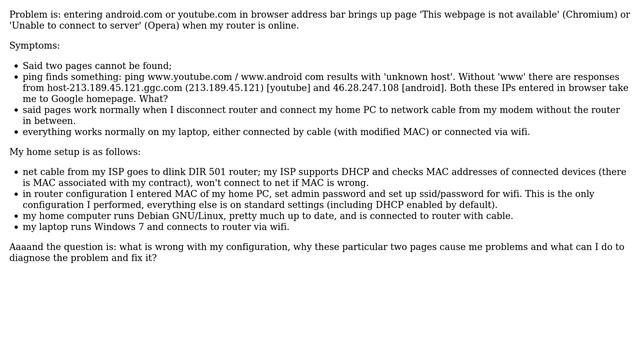 Cannot connect to android.com / youtube.com with router on Helpful? Please support me on Patreon: https://www.patreon.com/roelvandepaar With thanks & praise to God, and with thanks to the many people who have made this project possible! | Content (except music & images) licensed under CC BY-SA https://meta.stackexchange.com/help/licensing | Music: https://www.bensound.com/licensing | Images: https://stocksnap.io/license & others | With thanks to user zencodism (superuser.com/users/162816), user wtaniguchi (superuser.com/users/3955), user Hennes (superuser.com/users/121352), and the Stack Exchange Network (superuser.com/questions/482873). Trademarks are property of their respective owners. Disclaimer: All information is provided "AS IS" without warranty of any kind. You are responsible for your own actions. Please contact me if anything is amiss at Roel D.OT VandePaar A.T gmail.com