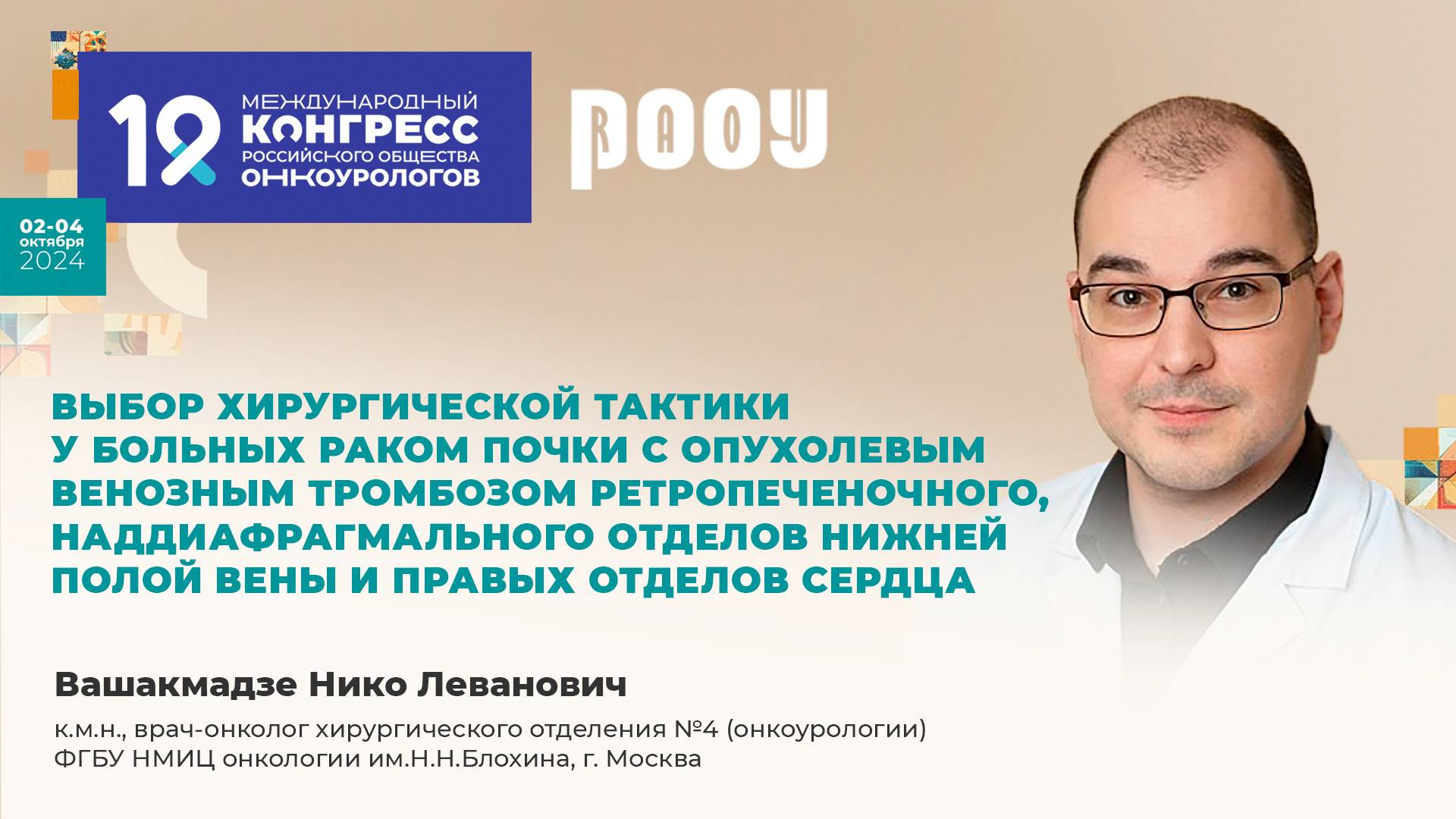 2 октября на XIX Международном Конгрессе РООУ Вашакмадзе Н. Л. представил доклад на тему: "Выбор хирургической тактики у больных раком почки с опухолевым венозным тромбозом ретропеченочного, наддиафрагмального отделов нижней полой вены и правых отделов сердца". ✅ Эксперт: Вашакмадзе Нико Леванович, к.м.н., врач-онколог хирургического отделение №4 (онкоурологии) ФГБУ «НМИЦ онкологии им. Н.Н. Блохина» Минздрава РФ, г. Москва. ❗ ➡️ Официальный сайт РООУ: https://roou.ru/ Присоединяйтесь к нам в социальных сетях. Делитесь мнением и повышайте уровень теоретической и практической подготовки в онкоурологии: Telegram: https://t.me/oncologyurology ВКонтакте: https://vk.com/oncologyurology