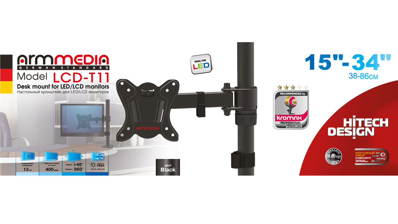 Кронштейн для крепления телевизоров и мониторов ARM MEDIA LCD-T11 BLACK надёжно удержит экран размером 15"-34" дюйма и весом 12 кг. Регулировка позволит вращать монитор на 360°, наклонять вверх и вниз на ±45°, и поворачивать влево и вправо на 360° – для оптимального угла зрения и удобной посадки. ARM MEDIA LCD-T11 BLACK имеет настольный тип установки с механизмом защиты от падения. Крепёжные отверстия настольного кронштейна ARM MEDIA LCD-T11 BLACK изготовлены по международному стандарту VESA. Кронштейн подходит для большинства мониторов популярных брендов, среди которых Samsung, LG, Sony, Panasonic, Sharp, Toshiba, Dell, ASUS, HP, Acer, BenQ, MSI, Philips, Lenovo, Sceptre, ViewSonic, Gigabyte, AOC, Viotek и других. В комплектацию ARM MEDIA LCD-T11 BLACK входят необходимые для монтажа материалы. Вся продукция обеспечивается гарантийными обязательствами. 18 лет гарантии на все сварные и механические соединения позволит наслаждаться конструкцией долгий срок. Во время эксплуатации ARM MEDIA LCD-T11 BLACK демонстрирует поразительную износостойкость и безотказность. Подробнее https://www.kromax.ru/produce/the_brackets_for_the_1st_monitor/4234/