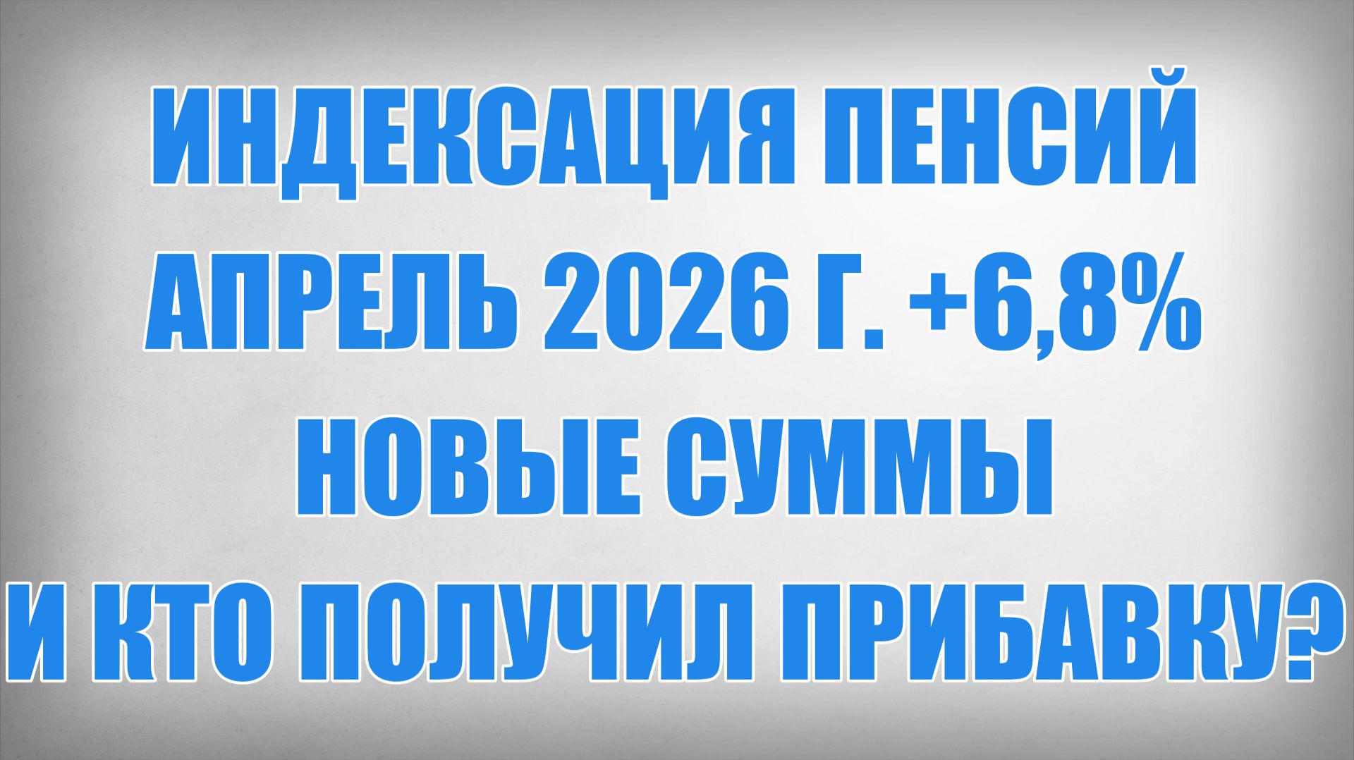 Индексация Пенсий Апрель 2026 г. +6,8% — новые суммы и кто получил прибавку? С первого апреля две тысячи двадцать шестого года социальные пенсии в России повысили на шесть целых восемь десятых процента. Уже сегодня выплаты выросли у более чем четырёх миллионов трёхсот тысяч человек. Прибавка пришла автоматически вместе с обычной пенсией. Средний размер социальной пенсии после индексации увеличился больше чем на одну тысячу рублей и теперь составляет около шестнадцати с половиной тысяч рублей. Давайте разберём конкретные суммы. Базовая социальная пенсия по старости выросла с восьми тысяч восьмисот двадцати четырёх рублей до девяти тысяч четырёхсот двадцати четырёх рублей. Инвалиды первой группы получили прибавку примерно в одну тысячу двести рублей. Теперь их пенсия составляет восемнадцать тысяч восемьсот сорок восемь рублей. Детям-инвалидам и инвалидам с детства первой группы добавили около одной тысячи четырёхсот рублей. Их выплата увеличилась до двадцати двух тысяч шестисот семнадцати рублей. На шесть целых восемь десятых процента также повысили государственное пенсионное обеспечение. Это коснулось военнослужащих, проходивших службу по призыву, участников Великой Отечественной войны, жителей блокадного Ленинграда, осаждённого Севастополя и Сталинграда, лётчиков-испытателей, космонавтов, а также граждан, пострадавших от радиационных и техногенных катастроф, и членов их семей. Социальные пенсии назначают тем, у кого не хватает страхового стажа для обычной пенсии по старости, инвалидам всех групп, детям-инвалидам и детям, потерявшим кормильца. Всё повышение произошло автоматически. Никаких заявлений подавать не нужно было. Социальный фонд России сам провёл перерасчёт. Если после индексации ваша общая пенсия в регионе оказалась ниже прожиточного минимума пенсионера, то автоматически должна быть назначена социальная доплата до нужного уровня. Многие пенсионеры уже получили повышенные выплаты по своему обычному графику. Проверьте поступления за апрель. Прибавка должна уже прийти. Если материал был полезен — ставьте лайк и подписывайтесь на канал, чтобы не пропускать свежие новости о пенсиях и социальных выплатах!