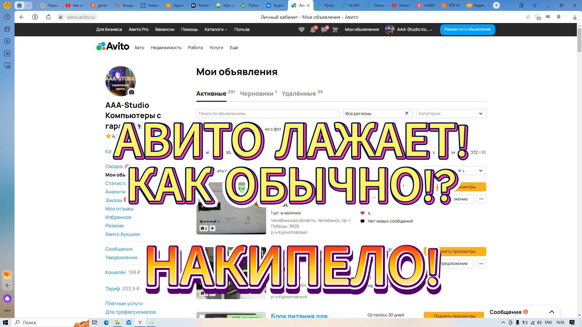 Ролик о том как авито поступает со своими постоянными клиентами. Какое то кидалово! И где искать справедливость, ведь поддержки на авито нет от слова совсем. Ну собственно это и есть будни комиссионки. Жду ваших комментариев и мнений по данной теме!. ---- Собираем компьютеры на заказ. Из новых и бывших в употреблении комплектующих. Для любых бюджетов от 2000р и до бесконечности. Быстро-Качественно-Недорого! Опыт более 20 лет! - Мы в YouTube @AAA-STUDIO74 "Будни комиссионки" - Мы в телеграм @AAA_STUDIO74 (t.me/aaa_studio74). Подписывайтесь чтобы не пропускать наши акции! - Мы в VK @SHEFF_AAA_STUDIO - C нашим ассортиментом можно ознакомиться на авито ( в самом авито в поисковой строке наберите aaa-studio, зайдите в профиль и ознакомьтесь) - Также пишите в viber/ whatsup по номеру 8-999-582-4729