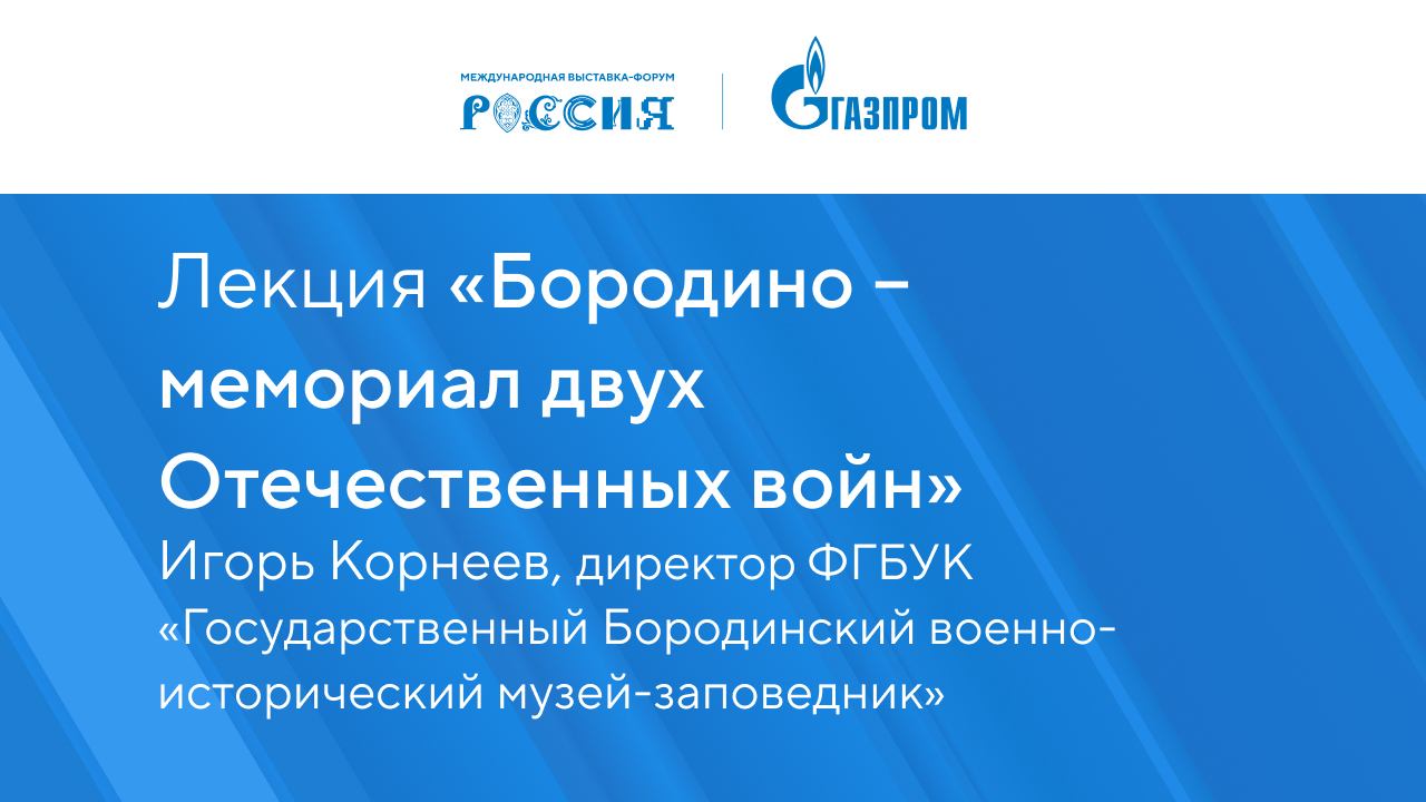 "Знакомство с историей войн на Бородинском поле, роль М.И. Кутузова в событиях, возможность выиграть сертификат на посещение «Бородино» и получить открытку 1912 года При поддержке ООО «Газпром трансгаз Москва» в Лектории «Газпром» пройдет встреча с директором ФГБУК «Государственный Бородинский военно-исторический музей-заповедник» Игорем Валерьевичем Корнеевым. На лекции он расскажет о начальном периоде войны 1812 года, назначении М.И. Кутузова главнокомандующим русской армией, Бородинском сражении, пожаре в Москве после ухода Наполеона, изгнании неприятеля из России. Игорь Валерьевич уделит внимание событиям Великой Отечественной войны, происходившим на Бородинском поле в 1942-1943 годы. В ходе блиц-викторины у слушателей будет возможность выиграть музейные сувениры, а также сертификат на посещение Культурно-исторического центра «Бородино». В Лектории будет работать музейная почта – участники встречи смогут получить открытки 1912 года."