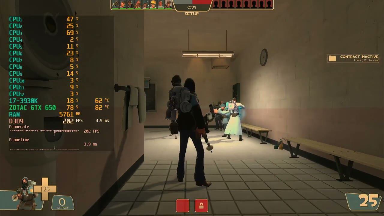 Game: Team Fortress 2 Сomputer characteristics: Socket: LGA 2011 Motherboard: Asus Sabertooth X79 Processor: i7 3930K 3.20GHZ RAM: HYPER X 16GB DDR3-DIMM 1600 GPU: ZOTAC GTX 650 GDDR5 2GB ROM: SSD 128GB+HDD 500GB Video in 1920x1080 resolution. Operating system: Windows 10 Pro