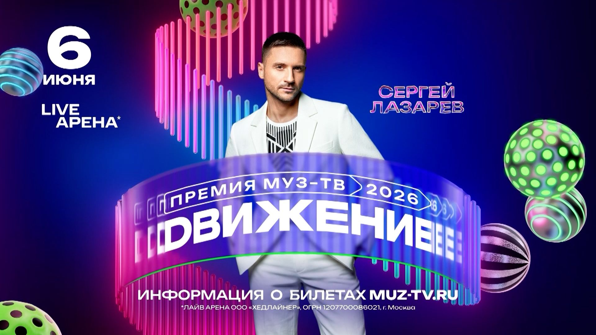 6 июня в Live Арена состоится ХXI Церемония Премии МУЗ-ТВ 2026. Движение. В этом году Премия МУЗ-ТВ начнёт писать новую историю, подведя музыкальные итоги прошедшего года, и обещает удивить инновационными технологиями, новаторскими режиссёрскими решениями и высочайшим уровнем спецэффектов. На сцене грандиозной музыкальной Премии страны и в прямом эфире телеканала появятся яркие представители шоу-бизнеса и преподнесут свои уникальные номера, созданные специально для Церемонии. Свои невероятные перфомансы готовят: легендарные маэстро Леонид Агутин и Владимир Пресняков, главный краш современности Ваня Дмитриенко, настоящий шоумен с невероятным тембром Сергей Лазарев, талантливая и обаятельная Люся Чеботина, обладательница чарующего голоса Мари Краймбрери, рекордсмен по количеству «тарелок Премии МУЗ-ТВ» Дима Билан и многие другие звёзды, чьи имена будут раскрыты совсем скоро. Какими хитами прогремят звёзды на сцене Церемонии и какие номера подготовят, станет известно уже 6 июня в Live Арена. Билеты на Премию МУЗ-ТВ 2026. Движение уже в продаже. Подробная информация на сайте muz-tv.ru