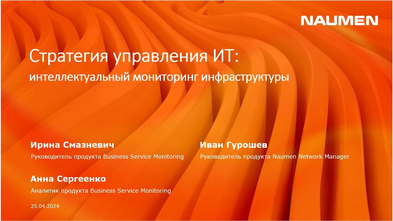 Naumen Business Service Management: https://vk.cc/cwqPss Naumen Network Manager: https://vk.cc/cwqPui 00:00 – формат вебинара 00:02:46 – цифровая экосистема для управления инфраструктурой 00:07:45 – зонтичный мониторинг 00:08:35 – зачем нужны разные системы мониторинга 00:10:02 – сбор информации о компонентах инфраструктуры в единую систему 00:10:31 – отслеживание состояния услуги 00:11:38 – визуализация связей между оборудованием, системами и услугами 00:12:08 – планирование изменения инфраструктуры 00:13:09 – заведение плановых профилактических работ в системе 00:14:05 – прогнозирование загрузки ресурсов 00:14:29 – предиктивная аналитика, проактивный мониторинг 00:15:09 – отслеживание метрик устройств и их комплексный анализ 00:16:41 – локализация неисправности 00:17:34 – детализация инфраструктуры до нужного уровня 00:18:11 – уведомления о неисправности без спама 00:19:25 – переход к управлению инцидентами от управления авариями 00:20:01 – идентификация поступивших событий 00:21:03 – анализ истории решения проблем 00:21:28 – отчеты по решению инцидентов 00:21:46 – что позволяет зонтичный мониторинг 00:22:17 – корневой мониторинг 00:22:50 – поиск первопричины сбоя 00:26:21 – РСМ на основе комплексных показателей 00:27:22 – Root Cause Analysis 00:29:27 – мониторинг новых отечественных устройств 00:31:38 – модельный каталог 00:32:59 – масштабирование мониторинга 00:35:16 – гибкие правила 00:37:48 – составление отчетов 00:38:23 – интеллектуальный поиск 00:39:10 – построение дашбордов 00:40:23 – корневой мониторинг в цифровой экосистеме и его преимущества 00:41:15 – итоги