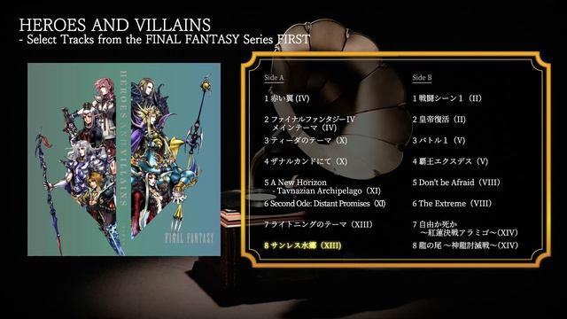 『HEROES AND VILLAINS - Select Tracks from the FINAL FANTASY Series FIRST』 発売日:2021年12月15日 ■収録曲 ※( )内の数字はファイナルファンタジーシリーズナンバリングです ≪A面≫ 1 赤い翼(IV) 2 ファイナルファンタジー IV メインテーマ(IV) 3 ティーダのテーマ(X) 4 ザナルカンドにて(X) 5 A New Horizon - Tavnazian Archipelago(XI) 6 Second Ode: Distant Promises(XI) 7 ライトニングのテーマ(XIII) 8 サンレス水郷(XIII) ≪B面≫ 1 戦闘シーン1(II) 2 皇帝復活(II) 3 バトル1(V) 4 覇王エクスデス(V) 5 Don't be Afraid(VIII) 6 The Extreme(VIII) 7 自由か死か ~紅蓮決戦アラミゴ~(XIV) 8 龍の尾 ~神龍討滅戦~(XIV) 詳細はこちら https://www.jp.square-enix.com/music/sem/page/HEROESANDVILLAINSLP/