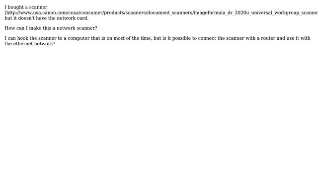 Scanner Canon DR-2020 U network Helpful? Please support me on Patreon: https://www.patreon.com/roelvandepaar With thanks & praise to God, and with thanks to the many people who have made this project possible! | Content (except music & images) licensed under CC BY-SA https://meta.stackexchange.com/help/licensing | Music: https://www.bensound.com/licensing | Images: https://stocksnap.io/license & others | With thanks to user Lorenzo (superuser.com/users/449265), user Fazer87 (superuser.com/users/304648), user CharlieRB (superuser.com/users/97028), user Andrea Ligios (superuser.com/users/204071), and the Stack Exchange Network (superuser.com/questions/916212). Trademarks are property of their respective owners. Disclaimer: All information is provided "AS IS" without warranty of any kind. You are responsible for your own actions. Please contact me if anything is amiss at Roel D.OT VandePaar A.T gmail.com