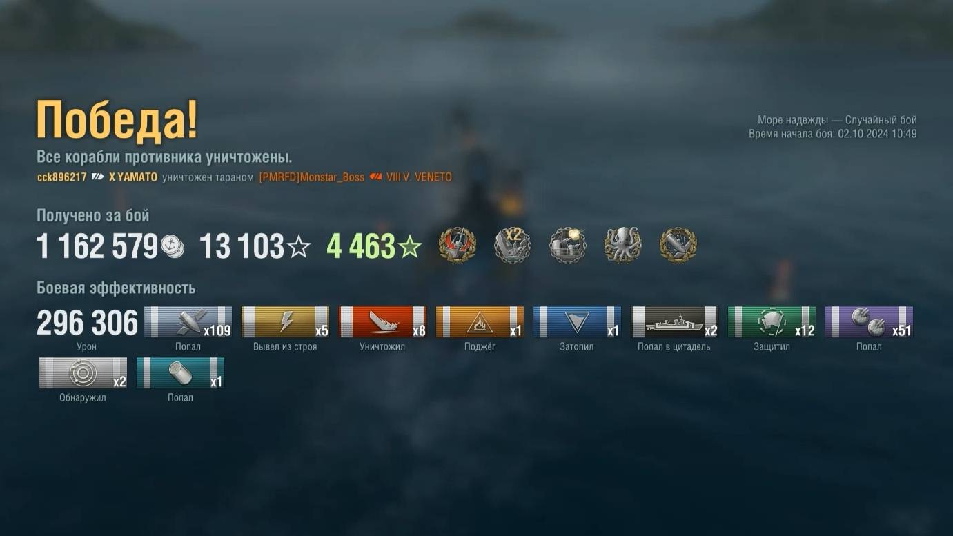 Линкор Yamato : +296к урона 8 фрагов на карте Море надежды - World of Warships