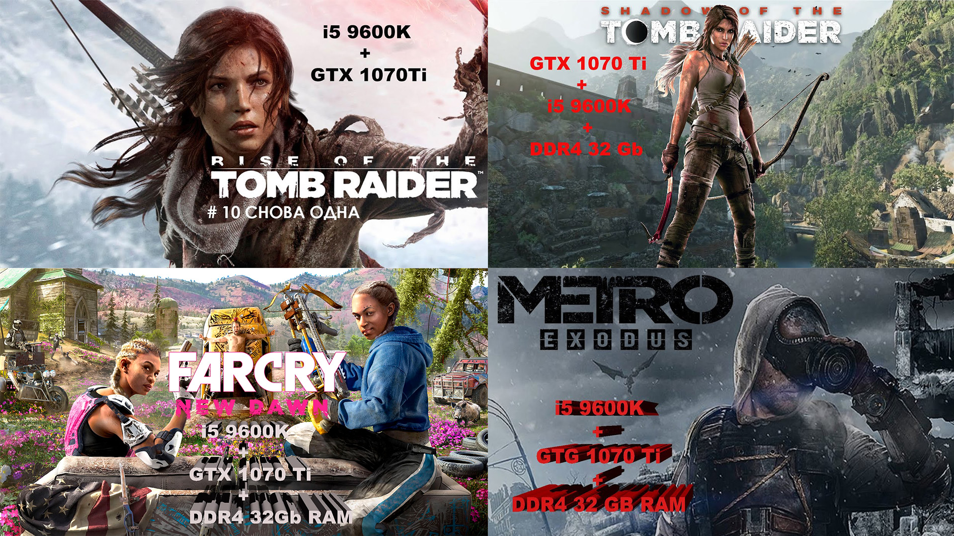 i5 9600K+1070Ti Test PC 00:00 Rise of the Tomb Raider 03:28 Shadow of the Tomb Raider 10:31 Far Cry New Dawn 13:28 Metro Exodus Тестовый стенд: 1. Процессор: i5 9600K 3,7-4,7 МГц; 2. Кулер:Zalman CNPS7X LED+ TDP 130 Вт; 3. Материнская плата: B360M D3H; 4. Оперативка:DDR4 32 Gb KILSRE 2666 МГц; 5. Видеокарта: GTX 1070Ti MSI GAMING; 6. Блок питания: Zalman 700 Вт; 7. SSD 240Gb r:580 Mbit/s, w:540 Mbit/s Windows; 8. SSD 720Gb r:580 Mbit/s, w:540 Mbit/s Games 9. System: Microsoft Windows 10 Pro. #игры #компьютеры #сборки #железо #тесты #RiseoftheTombRaider #FarCryNewDawn #MetroExodus #ShadowoftheTombRaider