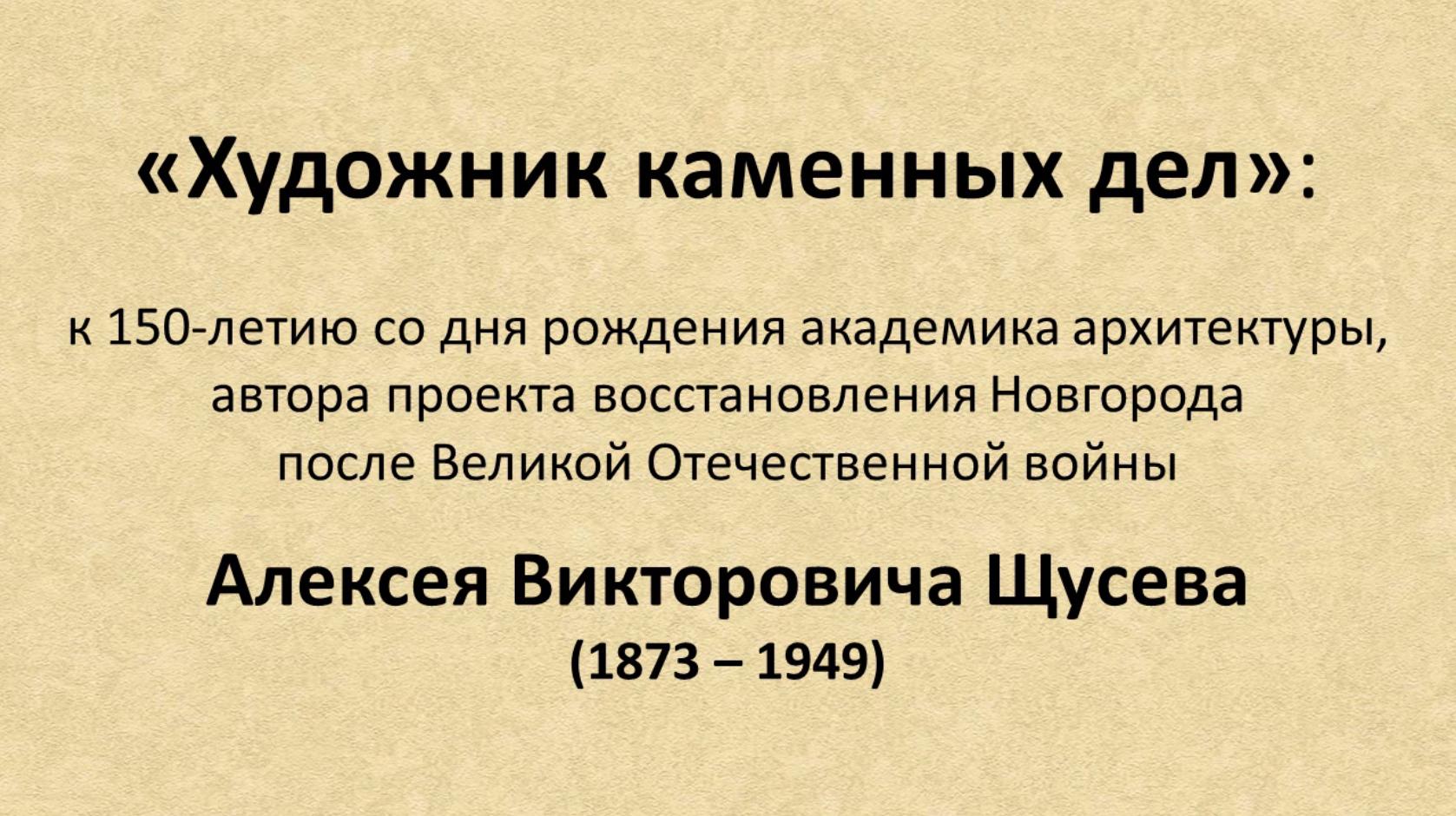 8 октября исполнилось 150 лет со дня рождения академика архитектуры, одного из крупнейших мастеров отечественной архитектуры первой половины XX века, автора проекта восстановления Новгорода после Великой Отечественной войны Алексея Викторовича Щусева (1873–1949). Вашему вниманию предлагаем виртуальный вариант выставки «Художник каменных дел». Приятного просмотра! Справки по телефону: 8(8162)77-37-88 – отдел краеведения.