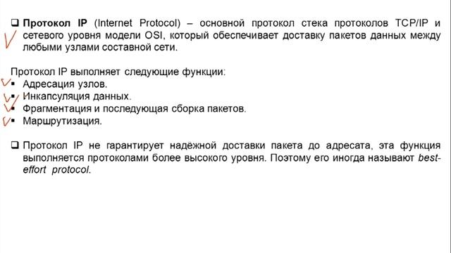 Лекция 9. Адресация сетевого уровня модели OSI Эта лекция посвящена изучению протокола IP, который является основным протоколом сетевого уровня модели OSI и стека протоколов TCP/IP. Вы познакомитесь с адресацией IPv4/v6, узнаете какие типы адресов IPv4/v6 бывают, научитесь конфигурировать IP-адреса, разбивать большие сети на подсети и проверять работоспособность протокола IP. Официальный сайт: https://www.dlink.ru Портал дистанционного обучения и сертификации: https://learn.dlink.ru/ ВКонтакте: https://vk.com/dlink.international