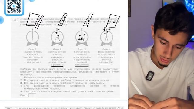 Учитель на уроке, используя палочку, кусок ткани и электроскоп, последовательно провёл - №20654