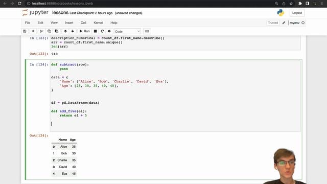 Pandas Уроки: Использование map() и apply() в Pandas - для начинающих. Урок 11 В этом видео мы разберемся в двух часто используемых методах Pandas - map() и apply(). Мы начнем с объяснения того, что такое map() и apply() и зачем они нужны, а затем перейдем к подробному рассмотрению их использования на примерах. Мы узнаем, как использовать map() для замены значений в столбцах, и как использовать apply() для применения пользовательской функции к столбцам или строкам данных. Мы также рассмотрим различные опции и возможности использования map() и apply(), в том числе работу с многомерными объектами и применение функций к группам данных.