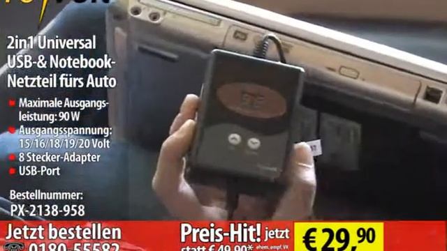 Direkter Link zum Pearl Online-Shop: http://goo.gl/M1JqA Auch unterwegs immer volle Power für Rechner und USB-Geräte! Die Multi-Lösung für alle, die viel mit Ihrem Notebook unterwegs sind: Ihr Notebook-Netzteil kann ab sofort zu Hause bleiben. So freuen sich beispielsweise Geschäftsreisende über einen stets aufgeladenen Notebook-Akku und müssen beim Kunden nicht um eine Steckdose bitten. Das Universal-Netzteil ist auch genial, wenn Sie mit mehreren Notebooks unterwegs sind. Der zusätzliche USB-Stromausgang versorgt Ihr Navigationsgerät oder Ihren MP3-Player mit voller Energie. Die Spannungswahl erfolgt bequem per Tastendruck. Die von Ihnen gewählte Ausgangspannung wird dabei auf dem LCD-Display angezeigt. Das äußerst kompakte Netzteil ist so klein wie eine Zigarettenschachtel. Anschluss-Adapter für alle gängigen Notebooks erhalten Sie gleich mit dazu. * Unterstützte Ausgangsspannung: 15/16/18/19/20 Volt * USB-Port: 5 V / 500 mA * Eingangsspannung: 11-14 V DC z.B. Zigarettenanzünder * Maximale Ausgangsleistung: 90 W (4,3 A) * Kabellänge: 150 cm * Angenehm kompakte Maße: 64 x 92 x 25 mm, 110 g leicht * Inklusive 8 Stecker-Adaptern (Hohlstecker 6,3x3 / 5,5x2,5 / 5,5x2,1 / 4,8x1,7 / 5,5x1,7 / 4,0x1,7 / 3,5x1,35 mm sowie für Dell-Notebooks 6,0 x 4,3 x 1 mm), deutsche Anleitung