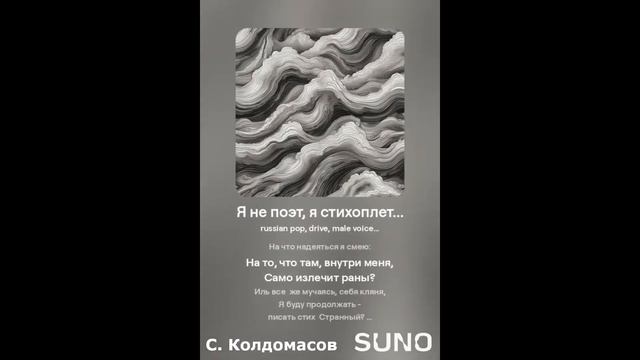 Русская поп-музыка. Текст - С. Колдомасов Аудио и визуал - Suno AI Стихи: Сергей Колдомасов - "Я не поэт, я стихоплет..." (2023/02/15) (на сайте стихи.ру). Никакой вульгарщины или пропаганды, все совпадения чисто совпадения!