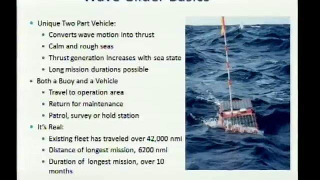 (October 28, 2009) Roger Hine of Liquid Robotics discusses the Wave Glider, a new technology dedicated to collecting data about the ocean. The Wave Glider uses solar panels to harvest energy from the sun to propel itself, allowing for the Wave Glider to travel long distance without needing to refuel. Stanford University: http://www.stanford.edu/ Stanford Center for Professional Development: http://scpd.stanford.edu/ Stanford Engineering Everywhere: http://see.stanford.edu/ Stanford University Channel on YouTube: http://www.youtube.com/stanford/