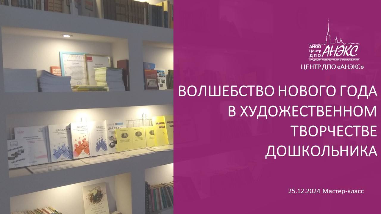 Ведущие: Бутина Ольга Анатольевна, Старший преподаватель кафедры дошкольного образования ГАОУ ДПО "Ленинградского областного института развития образования" , почетный работник общего образования. Секции: - Советы по оформлению выставки Новогоднего рисунка в группе детского сада - Создание условий для совместной деятельности родителей и детей подготовки к Новогоднему празднику Что вас ждет: Цель: ознакомление слушателей с методическими приемами развития художественно-творческих навыков детей дошкольного возраста посредством использования различных техник рисования. План проведения: Тема «Нового года» в художественно-эстетической деятельности дошкольника в детском саду. Техники рисунка Новогодней открытки. Традиционные и нетрадиционные методы создания рисунков, чтобы каждый ребенок мог выразить свои творческие способности и фантазии. Работа с родителями. Индивидуальные и групповые консультации, направленные на поддержку творческих начинаний ребенка дома.