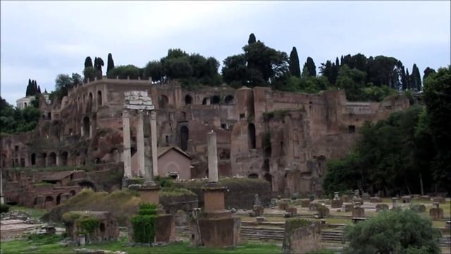 Римський форум. В центрі — колони храму Сатурна, за ними тріумфальна Арка Септіміуса Северуса. Храм Сатурна — храм на Римському форумі. Тріумфальна арка Септімія Севера (італ. Arco di Settimio Severo) — триарочна арка, розташована в північній частині Римського Форуму між Курією і Ростра на стародавній Священній дорозі (Via Sacra). Побудована в 205 на честь перемог імператора Септімія Севера й його синів Каракалли та Ґети над Парфією в двох військових кампаніях 195—203.