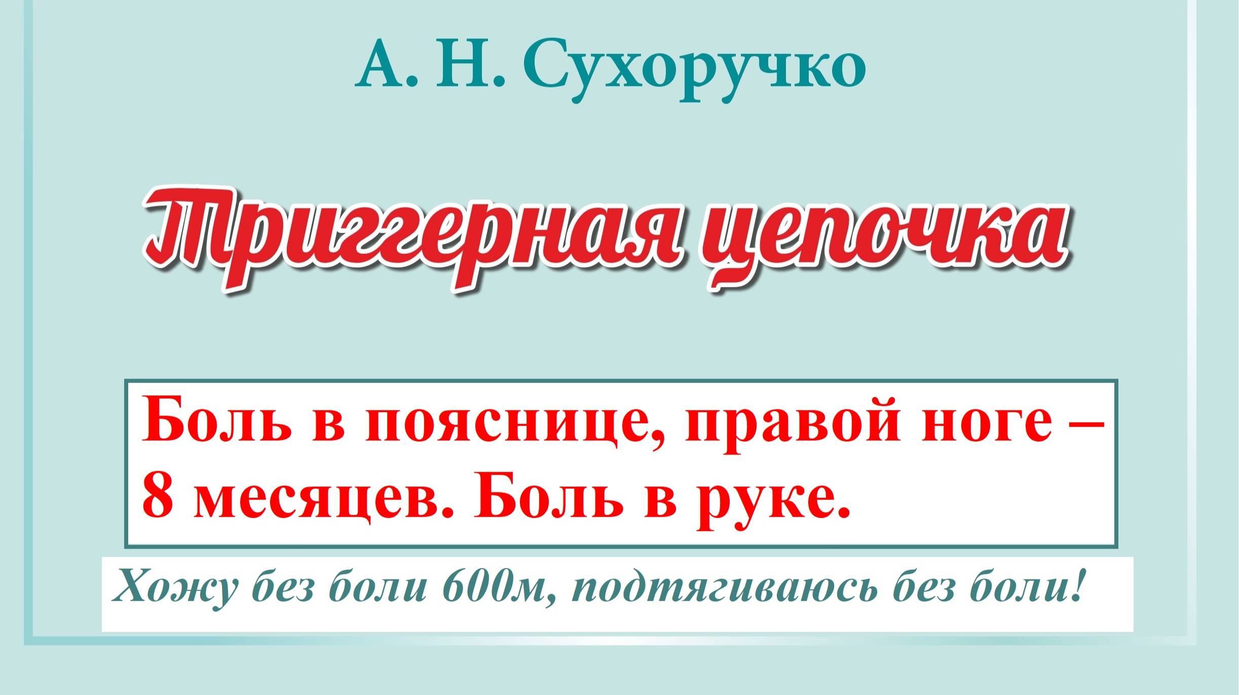 Боль в пояснице, правой ноге – 8 месяцев. Боль в руке. Хожу без боли 600м, подтягиваюсь без боли! "Триггерная цепочка" Сухоручко А.Н. - это русская инновация оздоровления организма, без: неврологии, лекарств, МРТ, УЗИ, нейрохирургии, остеопатии, мануальной терапии, костоправства, тренажёров. Триггерная цепочка устанавливает диагноз, определяет тактику оздоровления и профилактики; устраняет боли, головокружение, онемение; восстанавливает и укрепляет работу позвоночника, суставов; вертикализирует осанку. Почувствуй легкость, энергию, силу — без мигрени, грыжи диска, остеохондроза, невралгий, артроза, сколиоза, панической атаки! Подробней читать в книге А.Н. Сухоручко "Триггерная цепочка. Энциклопедия здоровья позвоночника и суставов" / сайт сухоручко.рф