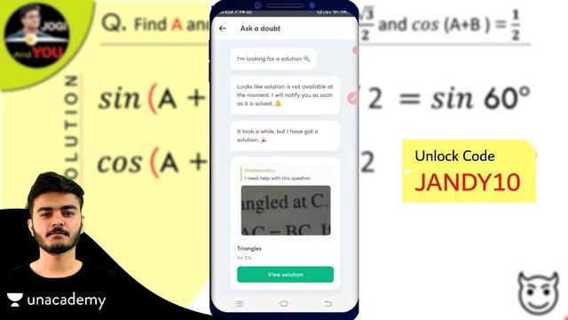 ● Ask your doubts, 24X7 for FREE ● Use "JANDY10" To Unlock this Feature. Class 6- https://bit.ly/3p9PUwd Class 7- https://bit.ly/3pgl2dn Class 8- https://bit.ly/3ab0Nto Class 9- https://bit.ly/2Zcin9T Class 10- https://bit.ly/3pdJXOL Class 11- https://bit.ly/3p7wQi4 Class 12- https://bit.ly/2Z7LATl ------------------●●● Learn LIVE with India’s best educators on Unacademy Plus. Get a subscription using my referral code JANDY10 and get 10% off! https://unacademy.com/plus/ ------------------------------------●●● Q. Find A and B, if 𝑠𝑖𝑛(A+2B)=√𝟑/𝟐 and 𝑐𝑜𝑠(A+B)=𝟏/𝟐 | with Unacademy by Jogi And You in Hinglish | in Hindi ------------------------------------●●● ● A few Topics Covered in this Video: - Q. Find A and B, if 𝑠𝑖𝑛(A+2B)=√𝟑÷𝟐 and 𝑐𝑜𝑠(A+B)=𝟏÷𝟐 - trigonometry class 10 - trigonometric equations & trigonometric ratios - solution of trigonometric identities class 10 cbse - trigonometric formulas and identities - trigonometric formulas tricks - trigonometric identities tricks for class 10 - trigonometric solved problems with trig identities tricks - trigonometric identities tips and tricks - proving trigonometric identities tricks - trigonometry tricks sin theta cos theta 10th class ------------------●●● ● About us ::: "Jogi and You Maths Tricks" is a place, where you can find different types of Questions and Solutions about Maths by 'Sir Jogendra Singh'. The vision of the "Jogi And You" team is to help students master life. Here you can learn different methods related to Mathematics. After that you can solve all, How to mathematics problems. ------------------●●● Be Connected::: ● Numerica Maths : https://www.youtube.com/c/NumericaMaths ● Numerica G.K. : https://www.youtube.com/channel/UC2p-bvkFJ6-2pZqsCYK1YoA ● Meri Kalam : https://www.youtube.com/c/MeriKalam ● Facebook : https://www.facebook.com/JogiAndYou ● Twitter: http ://www.twitter.com/JogiAndYou ● Instagram : @JogiAndYou ● Email- JogiAndYou@gmail.com Thank You & Keep Supporting. New Videos will be posted randomly... :-) ------------------●●● #JogendraSir #JogiAndYou #JogiSir #math #Maths #FastMathTrick #VedicMath #mathpractice #imaginemth #CBSEClass10Maths