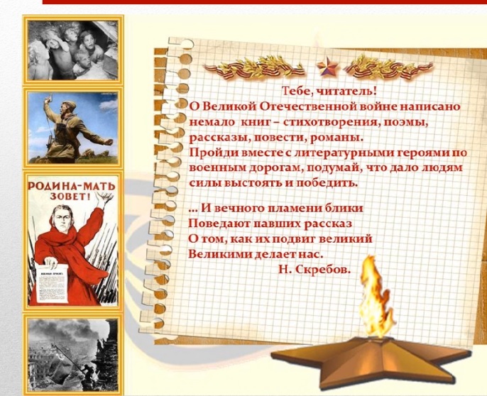 77 лет прошло… Но память о Великой Отечественной войне мы храним и по сей день. Мы знаем, как тяжело было солдатам на передовой и тем, кто трудился в тылу, детям 40-х годов. Откуда нам это известно? Из уроков истории, военных фильмов и, конечно, из книг. Книги – это своеобразный мостик, позволяющий заглянуть в прошлое. Книги хранят память далёких дней, великих подвигов. Книги о войне надо читать с детства, чтобы не утерять нить памяти о доблести наших соотечественников, подаривших нам жизнь. Главный библиотекарь Ивановской сельской библиотеки-филиала№15 МБУК «Анапская ЦБС» Варфоломеева Н.А.