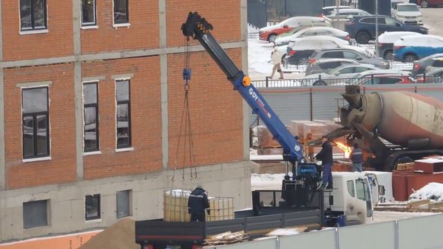 Манипулятор разгружается а на заднем плане у Бетономешалки, что то поджигают.