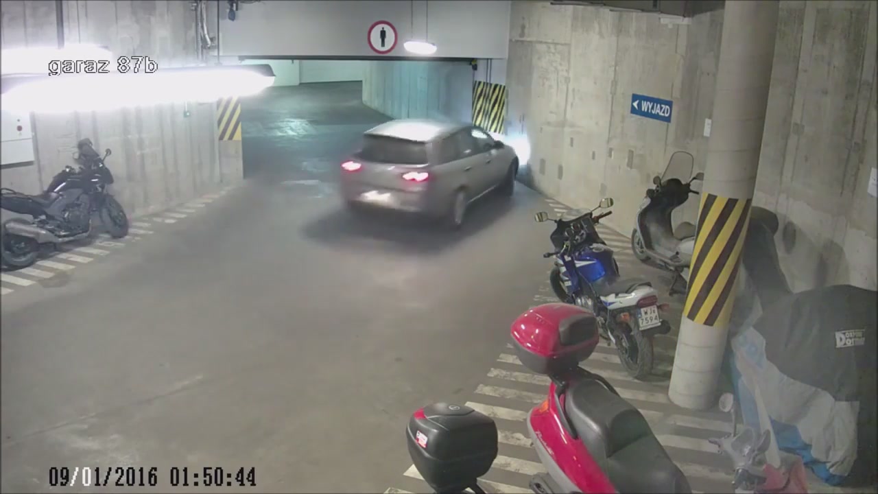 Камеры видеонаблюдения стали очевидцами, как пьяный мужчина выезжает из подземного гаража и совершает несколько столкновений.