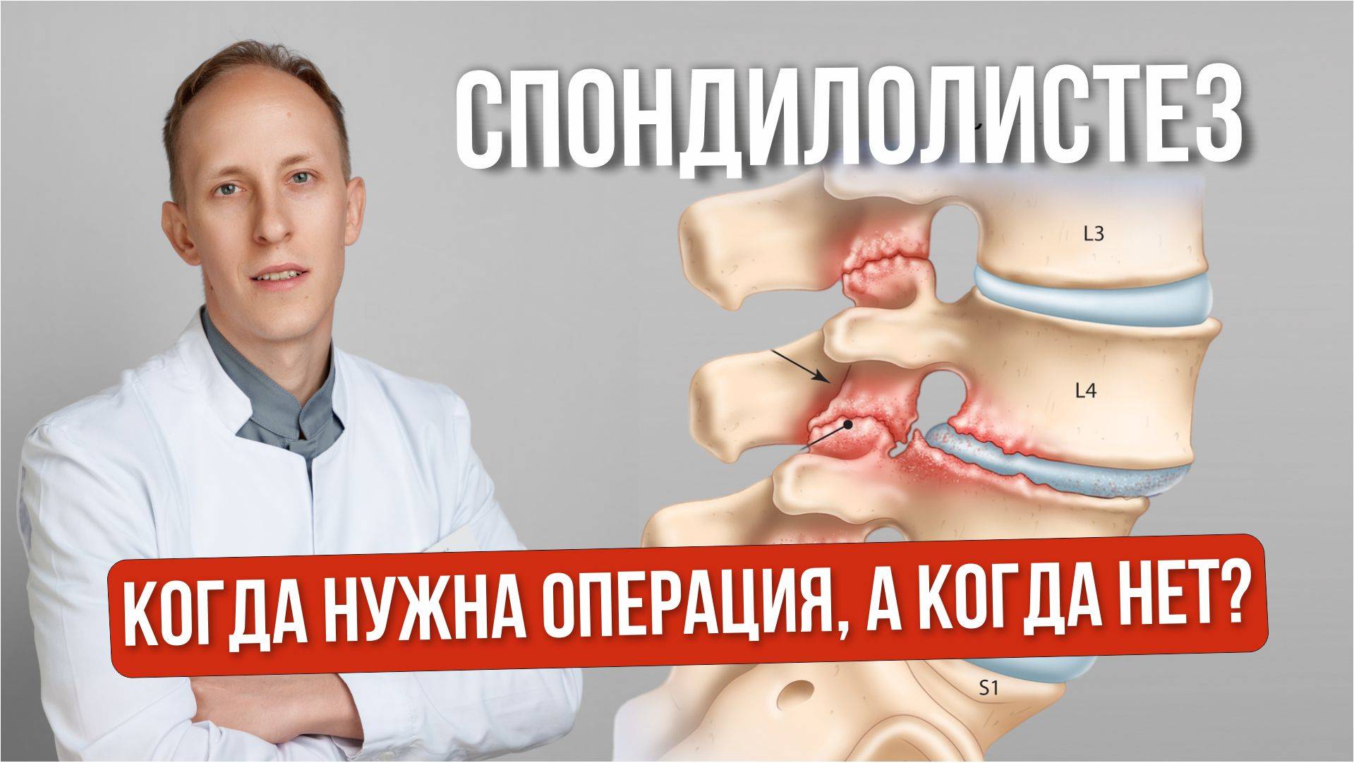 Спондилолистез – это смещение одного позвонка по отношению к другому. Лечение спондилолистеза является трудной задачей и вызывает много вопросов как у врачей, так и у пациентов. В этом видео мы рассмотрим современные методы лечения пациентов спондилолистезом и постараемся донести логику принятия решения о выборе того или иного метода лечения в зависимости от жалоб пациента и анализа его снимков. Таймкоды: 00:00 О чем будет видео 00:17 Что такое спондилолистез и какие симптомы он вызывает 02:09 Разбор МРТ пациентки со смещение позвонка 09:54 Хирургическое лечение спондилолистеза – суть операции 11:05 Консервативные методы лечения. Когда и какие использовать? 13:20 Блокада фасеточных суставов - когда оправдана? 15:04 Радиочастотная денервация фасеточных суставов 15:57 Эпидуральная трансфораминальная блокада корешка при боли в ноге 16:50 Другие методы лечения (физиолечение и мануальная терапия) 17:33 Итоги. Логика выбора метода лечения